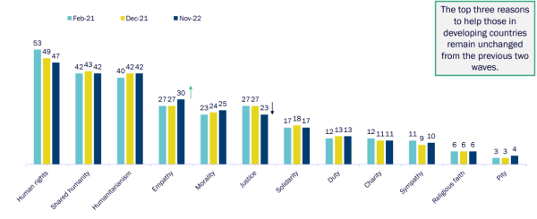 Human rights, shared humanity and humanitarianism are the top 3 most important reasons to help those in developing countries