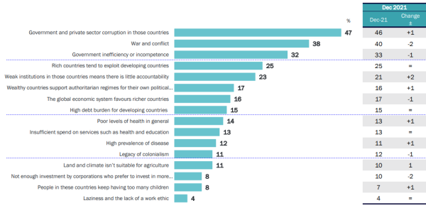 The main causes of perceived poverty in developing countries are Government and Private Sector corruption, war and conflict, and Government inefficiency or incompetence