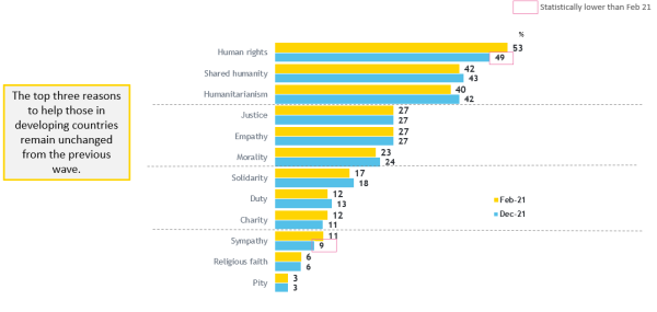 Human rights, shared humanity and humanitarianism are the top 3 most important reasons to help those in developing countries