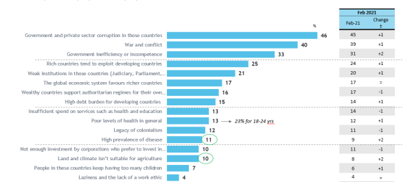 The main causes of perceived poverty in developing countries are Government and Private Sector corruption, war and conflict, and Government inefficiency or incompetence
