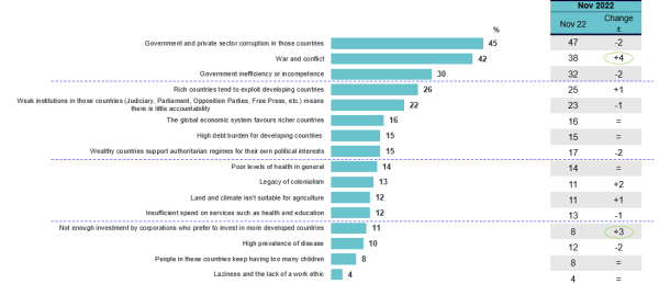 The main causes of perceived poverty in developing countries are Government and Private Sector corruption, war and conflict, and Government inefficiency or incompetence
