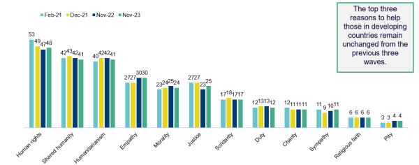 Human rights, shared humanity and humanitarianism are the top 3 most important reasons to help those in developing countries
