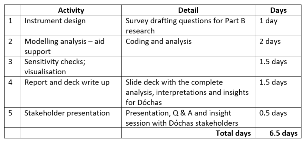 Payment for the days worked will be made on the production of an invoice when work is completed to the satisfaction of Dóchas. The consultant(s) can work remotely with in-person attendance expected for the launch events each year. The consultant(s) will be expected to communicate regularly on progress with Dóchas and inform Dóchas of any potential delays or schedule changes. Confidentiality relating to Dóchas data and processes not in the public domain will be respected by the consultant.