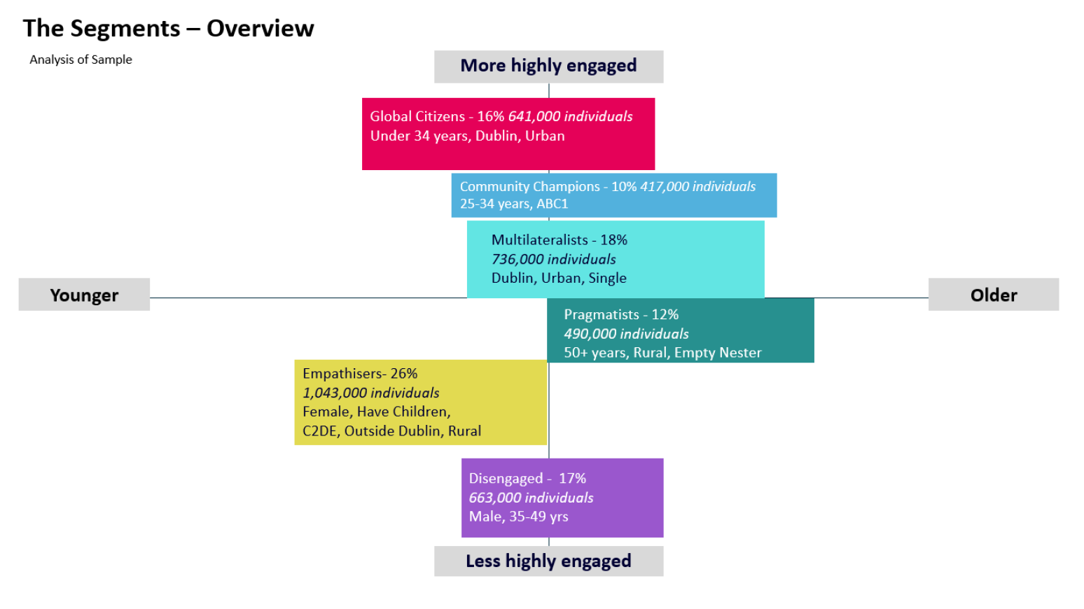 - Audience segmentation data and analysis which has been used to profile the Irish public. This research is used to identify and to segment the audience into clearly defined and usable groups that Dóchas members can utilise in their communications and engagement strategies.