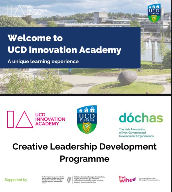 This course has been made possible by a Training Links Grant from The Wheel for a Leadership initiative supported by the Dóchas Small Members Working Group. A Steering Group of members from this Group worked in partnership with the UCD Innovation Academy to help create a course, criteria and process for a Leadership Programme tailored to our members.